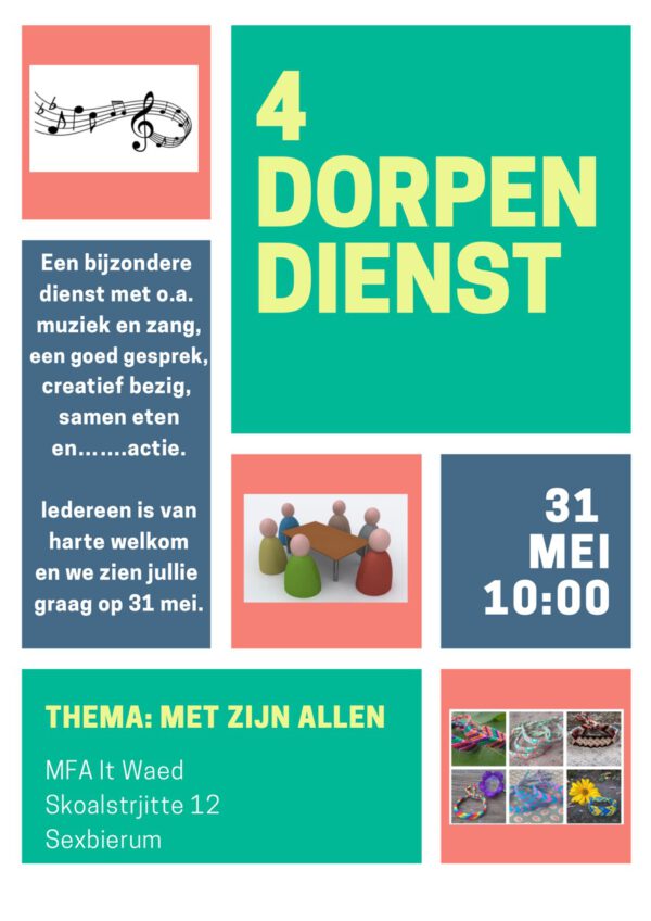 4-dorpendienst Collecten Nadere informatie Dienst start om 10.00 uur + Aan Google Kalender toevoegen + iCal / Outlook export Datum 31 mei 2026 Tijd 10:00 Locatie MFA It Waed Sexbierum Opening Hour 10.00 uur Deel dit evenement