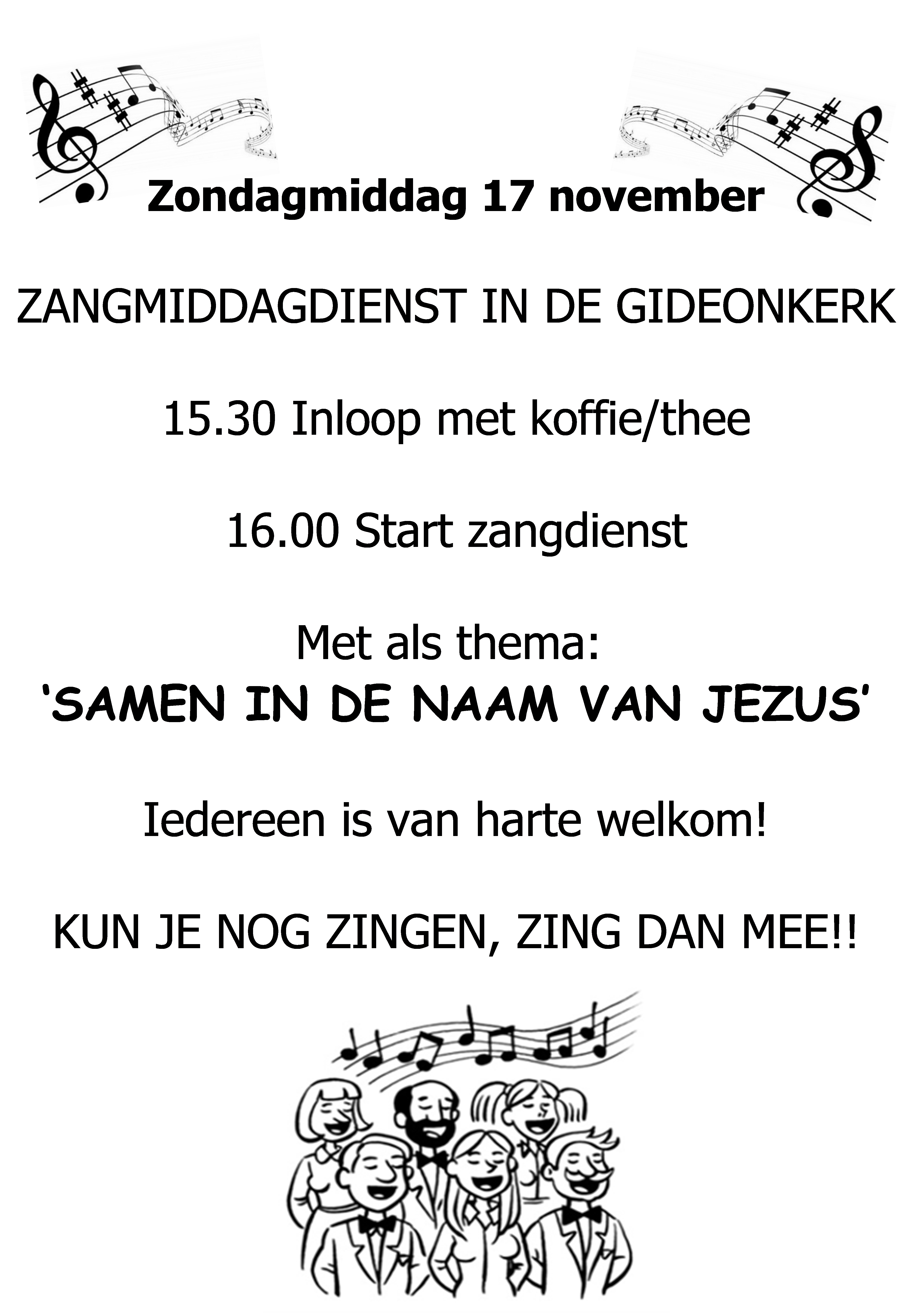 Zangmiddagdienst in de Gideonkerk + Aan Google Kalender toevoegen + iCal / Outlook export Datum 17 nov 2024 Is geweest Tijd 15.30 uur Inloop met koffie/thee 16:00 Deel dit evenement