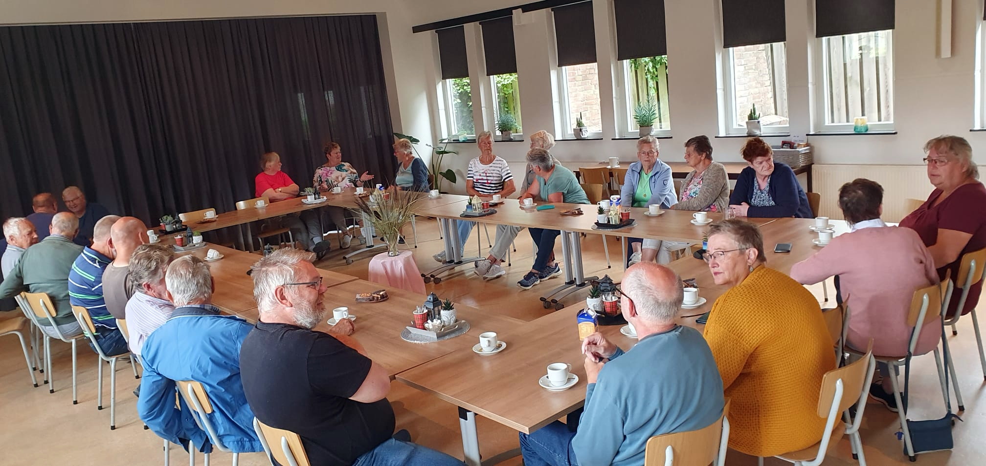 Gisteren was het koffiedrinken onder totaal andere weersomstandigheden. De meesten waren al gekleed in herfstkledij want het weer is deze week omgeslagen naar een meer herfstig weertype. Maar ook dat mag de pret niet drukken want de deelname aan de koffietafel in de warme ‘huiskamer’ was weer groot.