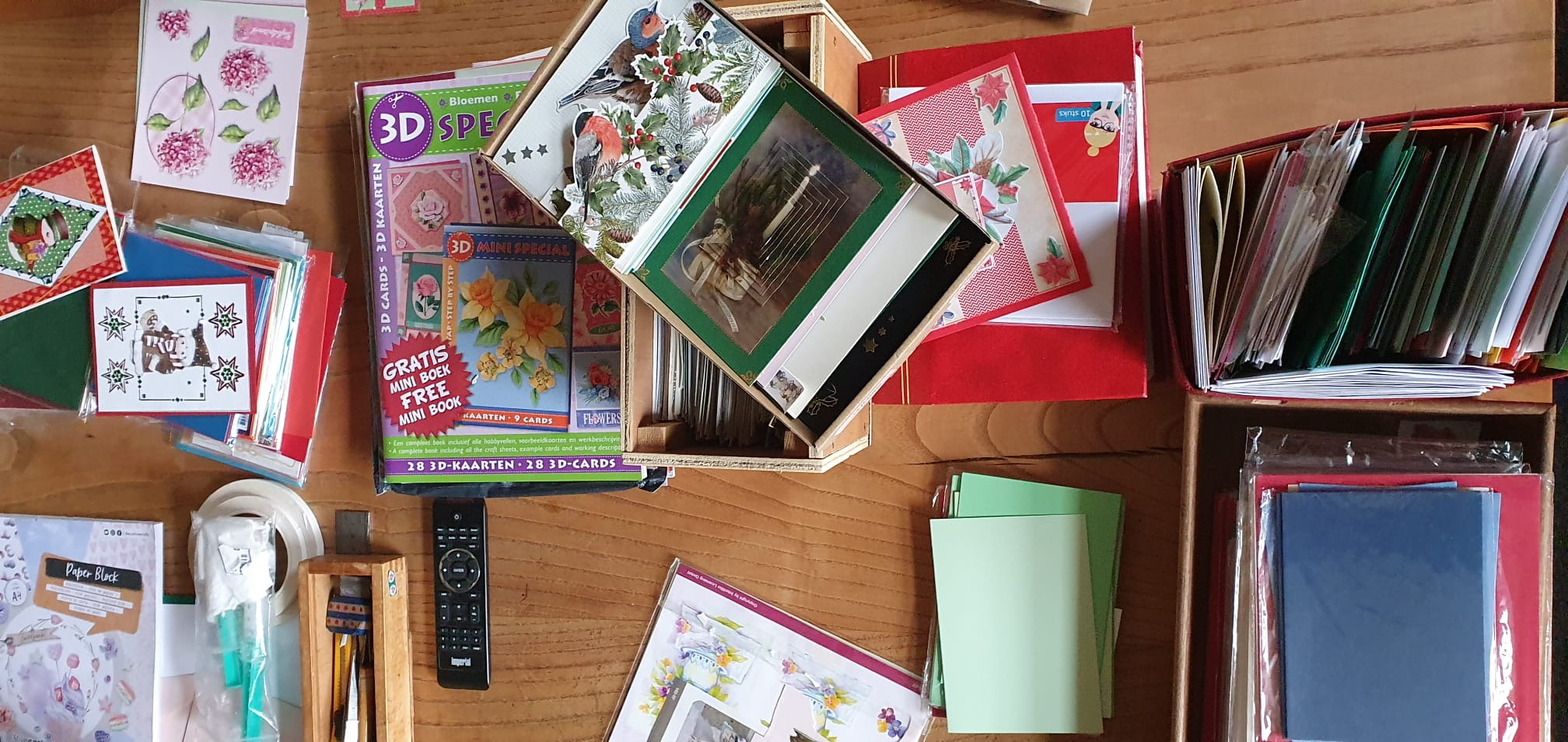 Vrijdag jl. is er weer een groepje bezig geweest met het maken van wenskaarten. Bij gastvrouw Tini Boomsma lag de tafel weer bezaaid met allerlei spullen om de mooiste kaarten in elkaar te knutselen.